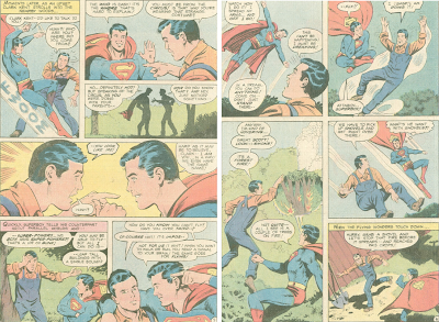 Apparently, young Clark has limitations to his ability that Superboy doesn't, so the latter trains the former to harness these powers. While able to levitate apparently motionless, the lad must use his superspeed and leaping until his flight develops during his young adult years. Note: This is no doubt due to his powers being inherent as all on Krypton-Two had such powers even on their own world, while citizens of Krypton-One only possessed superpowers under a different color sun...yellow instead of their red...and lighter gravity than that found on their native world. Hence, since such skills were developed internally from genetics on Earth-Two rather than externally through photosynthesis and kinethesis as on Earth-One. Yet on both worlds, their physiology was such that they'd display virtually identical powers while at their personal peaks.
